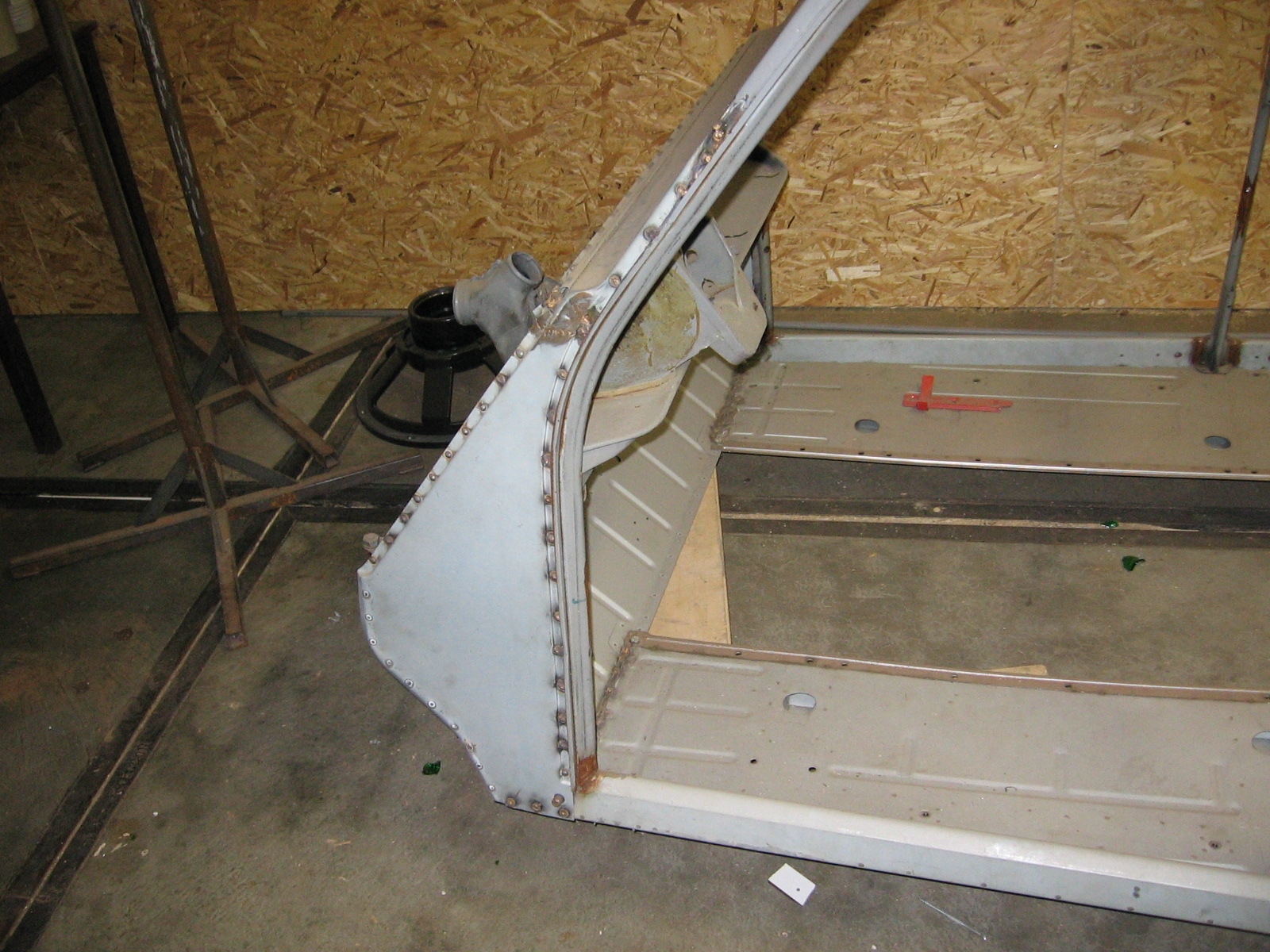 Over dat laswerk heeft Ernst zo zijn eigen methode en ideeën: zo doet hij niet alles met het bekende CO2 lasapparaat. Wel het grove werk met dragende delen. Maar voor het zogenaamde proplassen en het vullen van kleine gaatjes werkt hij met puls mig. Ook hiermee maak je een soort proplassen maar dan met een bronsdraad die tussen 2 smalle vlambogen wordt afgesmolten boven het alleen maar voorverwarmde metaal. Het vult zich heel geleidelijk zonder enige vervorming van het metaal eromheen en geeft een mooie vlakke halfronde las tussen de beide plaatwerkdelen. Het apparaat is geschikt tot 0,8 millimeter en hoger, dus dat gaat prima. Ook worden deze proplasjes niet zomaar met een afbraamschijf vlak geslepen. Zoals bij de restaurateurs bekend loop je hierbij de kans dat het plaatwerk rondom teveel beschadigd of te dun wordt of dat er zelfs nieuwe gaten ontstaan. Ernst werkt dit af met een elektrische power vijl, een handmatige mini bandschuurmachine waarmee je alles vrijwel vlak krijgt. Weer wat geleerd!