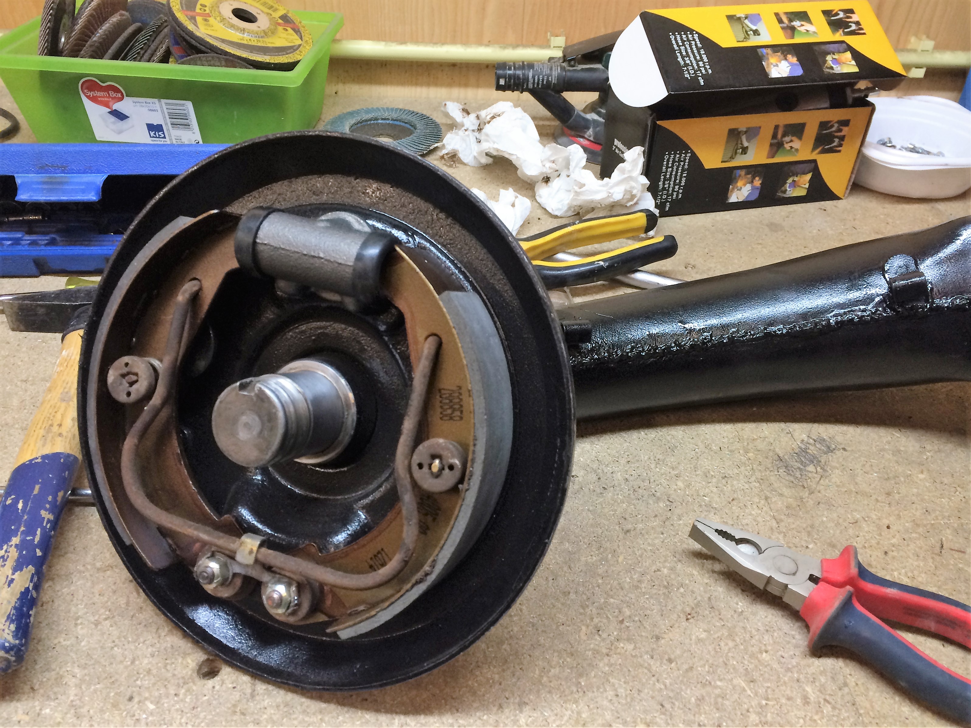 Wat is er allemaal al gedaan aan de eend? Zoals gezegd is de koets volledig gestript, zijn er in de nieuwe koets nieuwe bodemplaten ingelast, nieuwe dorpels, een nieuwe voetenbak, een half voorruitframe, de paravan aan beide kanten + de hoekjes onder de achterbank. Deze week wordt de complete reservewielbak er nieuw ingelast en volgen er nog kleine plaatwerkreparaties en daarna kunnen de diverse voor-behandelde onderdelen stuk voor stuk weer worden opgebouwd aan het chassis. Deze delen liggen nu te drogen na de tweede RX behandeling, zoals oa de draagarmen, die daarvoor volledig zijn kaal gemaakt. Remmen, lagers, rubbers, steekassen, alles ligt eraf. Alles is grondig schoon gemaakt en van nieuwe rubbers voorzien. Ook is er een nieuw deksel in een veerpot gelast nadat hier minstens een liter olie uit kwam. De nieuwe remschoenen en -cilinders liggen klaar voor montage.