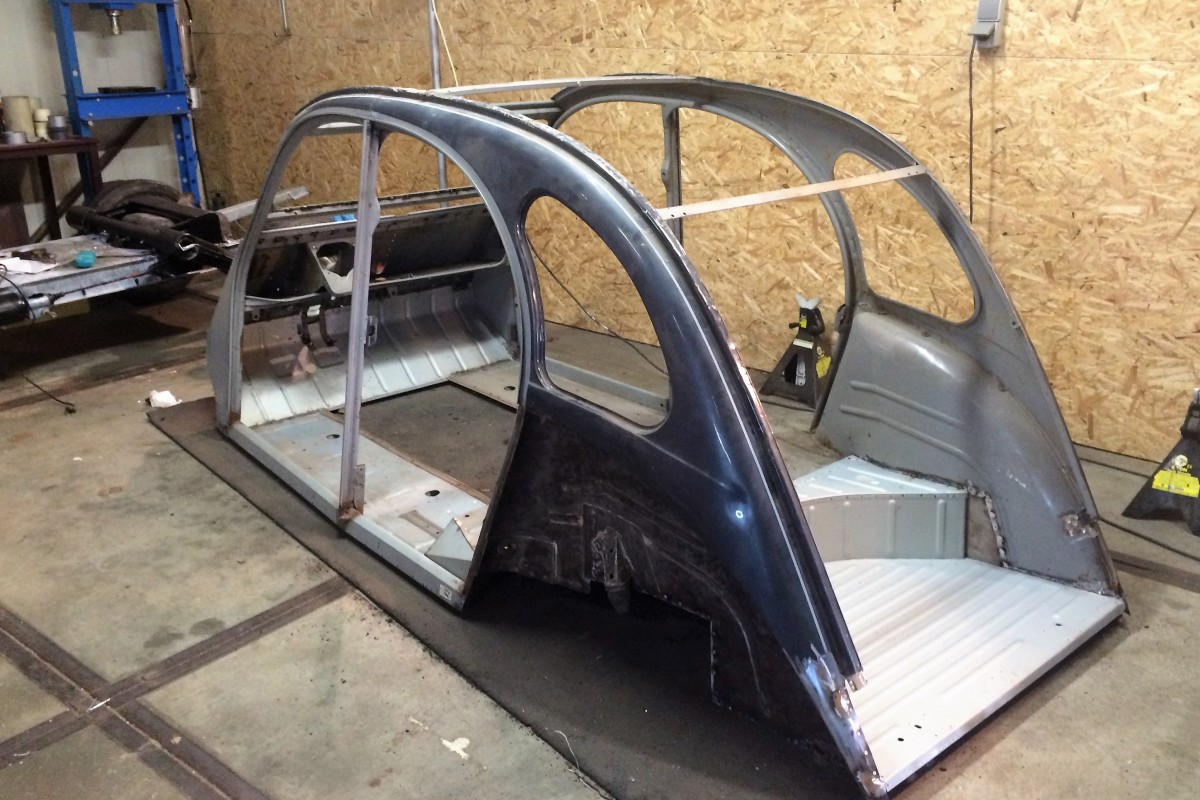 Toen, begin 2015 was zoon Victor aan de beurt voor een eend uit de restauratieschuur van de familie Schouten. Alleen leek het Ernst een beter idee om het deze keer samen met zijn zoon te gaan doen. Eerst werd er een barrel van een eend aangeschaft en gestript. Vervolgens mocht ik hem een vrij gave koets leveren en het noodzakelijke plaatwerk en tenslotte kwam maandag 21 december het gegalvaniseerde chassis binnen. Ernst en Victor werkten tussen de feestdagen door om het onderstel weer op te bouwen en de laatste delen van de koets te lassen.